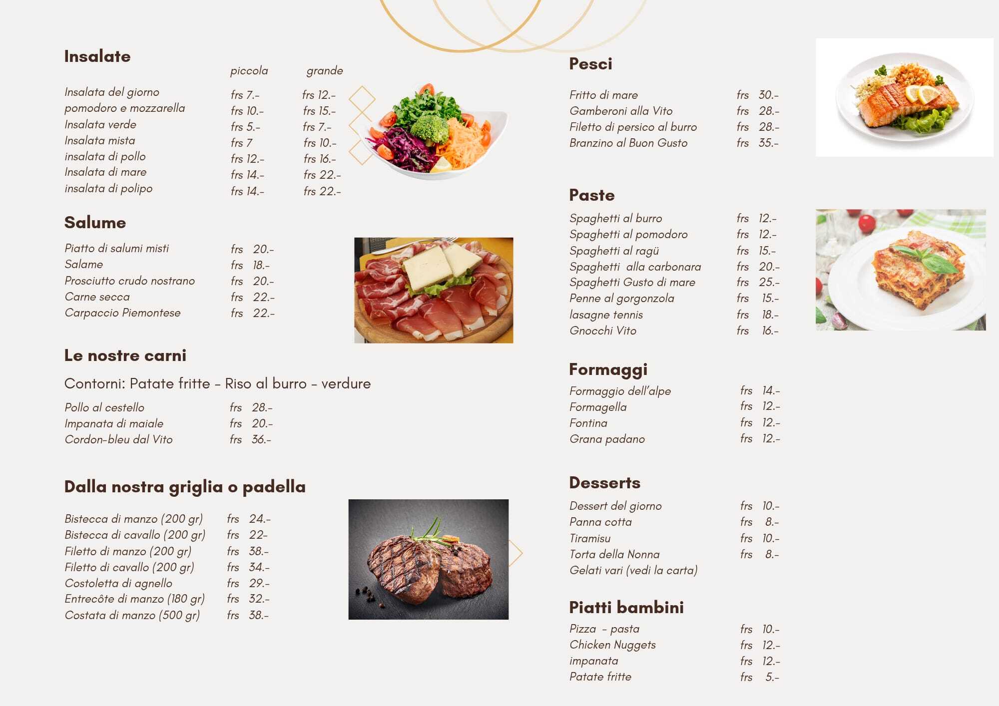Da Vito, proponiamo una cucina italiana sincera e gustosa. Utilizziamo ingredienti di qualità per preparare piatti curati e ricchi di sapore. Dalla carne al pesce, fino alla pasta e alle insalate, ogni piatto è pensato per offrire varietà e piacere a tavola. Le nostre paste seguono le ricette tradizionali italiane, mentre i piatti di carne e di pesce uniscono semplicità e gusto. Offriamo anche insalate e proposte leggere, perfette per chi desidera un pasto più fresco. E per finire, i nostri dolci fatti in casa completano il menu con un tocco genuino.